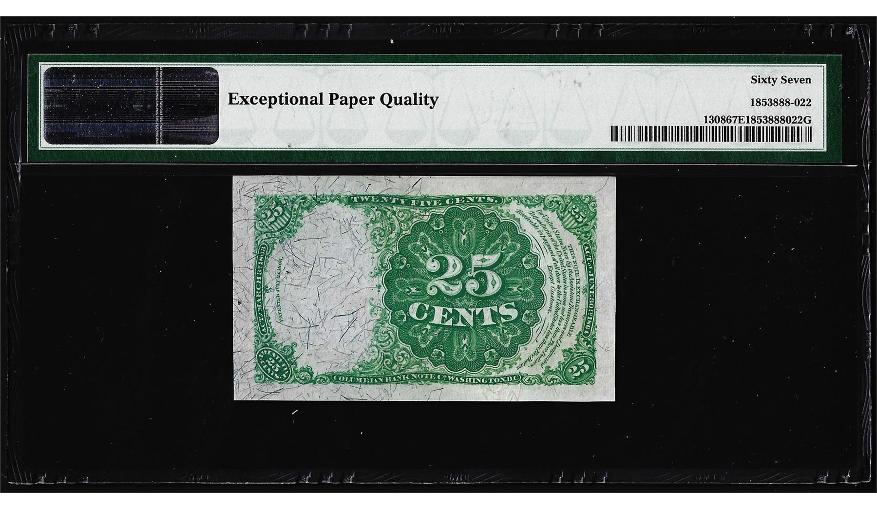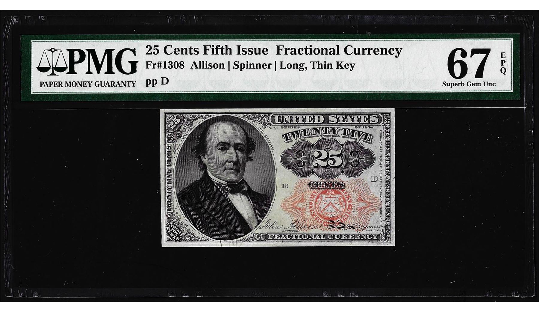 One 1874 25 Cents Fifth Issue Fractional Currency Note Fr.1309 PMG Superb Gem Unc 67EPQ. PMG Certified.