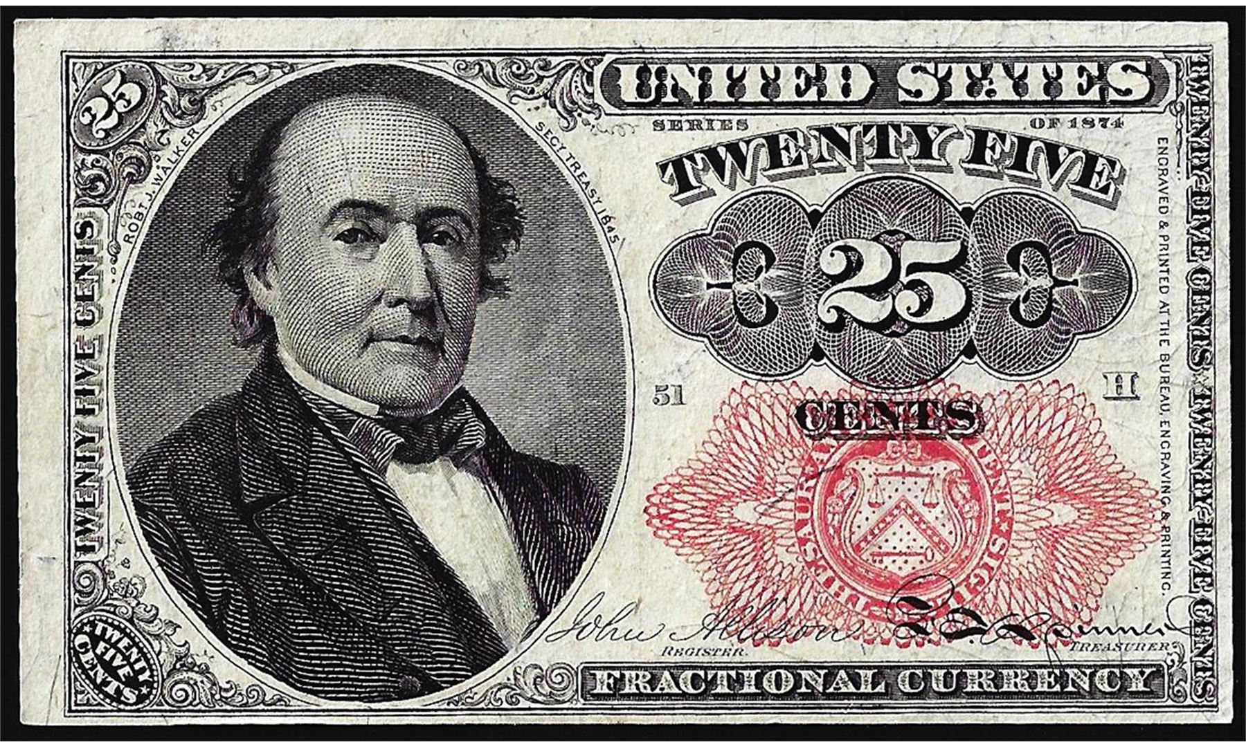 One 1874 25 Cents Fifth Issue Fractional Currency Note.