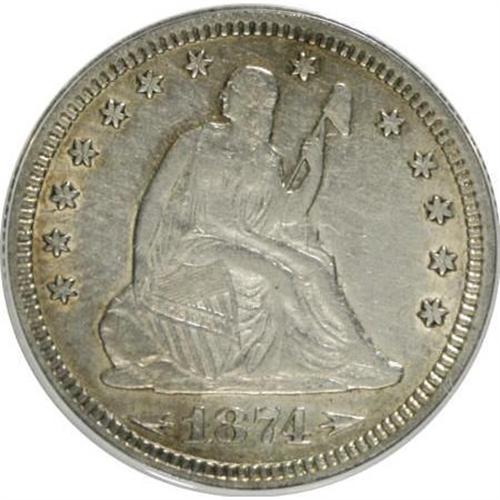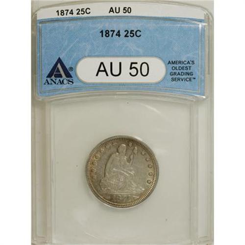 <B>1874 25C Arrows AU50 ANACS.</B></I> NGC Census: (1/54). PCGS Population (7/83). Mintage: 471,200. Numismedia Wsl. Price for NGC/PCGS coin in AU50: $421. (#5494)<BR><BR><B>Coin Engraver:</B> Christian Gobrecht<BR><BR><b>Shipping:</b> Coins & Currency (<a target="_blank" href="http://www.heritageauctions.com/common/shipping.php">view shipping information</a>\)