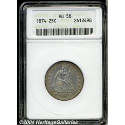 <B>1874<25C> Arrows AU58 ANACS.</B></I> Generally nicely struck, save for weak central details in most of the stars. The minimally abraded surfaces retain nice luster beneath light-gray toning in the centers that is framed by subtle gold-tan coloration around the rims.<BR><I>From The Paulsboro Collection.</B></I> <BR><BR><B>Important notice:</B> Heritage usually auctions material at the rate of 200-250 lots per hour. On some occasions eBay Live bid software or the Internet may not be able to keep up with the pace of the auction. We recommend placing a realistic absentee bid now as insurance to avoid disappointment. Occasionally the auctioneer may eliminate or reject an eBay Live bid, and the auctioneer may also reopen a lot after the close of the eBay live bidding (usually because we missed an audience bid), and may reject your bid even if it shows you as the winning bidder. By bidding via eBay Live, you agree that Heritage may award the lot to another bidder at its sole discretion under the circumstances described above or any other reasonable circumstances. Since eBay bids are not shown to us until we open the lot on the floor, we treat those bids just like floor bids. In most cases the floor responds before the eBay bid is presented to us, due to Internet lag time, so for consistency we have made it a policy that floor bids are always considered first over tie eBay live bids. Also please note that all Heritage lots purchased through eBay Live carry a 20% Buyer's Premium. Please make sure you read the Terms and Conditions before you bid.