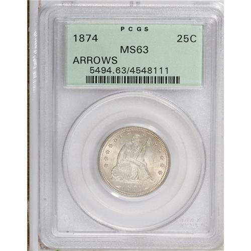 <B>1874 25C Arrows MS63 PCGS.</B></I> Both sides have light gold toning over frosty silver luster. A few darker iridescent spots are visible on the reverse. This is an attractive example housed in a green-label PCGS holder.<BR><I>From The Park Cities Collection.</B></I><BR><BR><b>Shipping:</b> Coin/Currency (<a target="_blank" href="http://www.heritageauctions.com/common/shipping.php">view shipping information</a>)