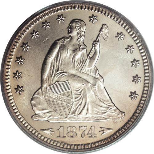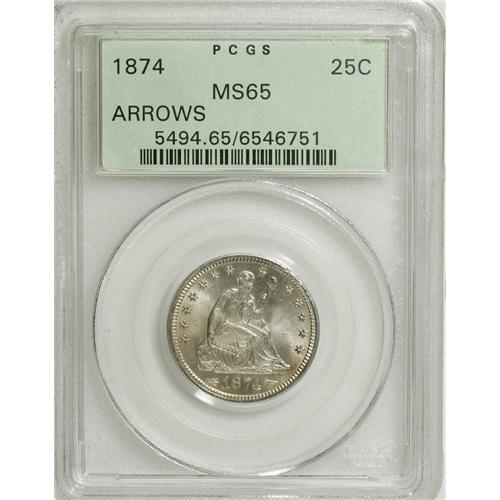 <B>1874 25C Arrows MS65 PCGS.</B></I> The 1874 quarter, with a mintage of 471,200 business strikes, is according to Larry Briggs, writing in his <I>Encyclopedia of Liberty Seated Quarters,</B></I> "Available with patience in all grades, but more difficult than the 1873 with arrows." The collector faces a greater challenge, however, at the Gem level of preservation, where precious fewer specimens have been certified by PCGS and NGC. Dazzling luster on the MS65 example in this lot enlivens essentially untoned surfaces, and a well executed strike has impressed bold definition on all of the design elements, which further enhances the coin's wonderful eye appeal. The reverse is virtually pristine, while a few minute obverse marks might have prevented an even higher grade. Housed in a green label holder. Population: 9 in 65, 5 finer (3/07).<BR><I>From The Palakika Collection.</B></I><BR><BR><b>Shipping:</b> Coins & Currency (<a target="_blank" href="http://www.heritageauctions.com/common/shipping.php">view shipping information</a>)