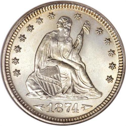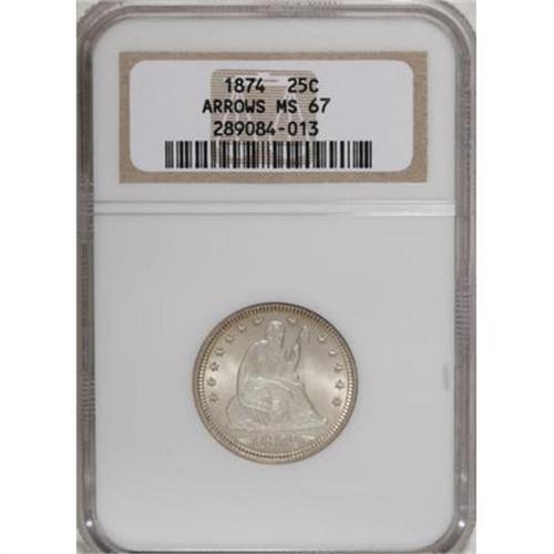 <B>1874 25C Arrows MS67 NGC.</B></I> Apparently the collecting public was not as interested in setting aside Arrows quarters from 1874 as they were in the first year. Superb examples of the 1874 are especially elusive with only this and one other piece certified (both by NGC). While most 1874 quarters are well struck, many show softness on the head of Liberty. This particular coin does not, displaying complete hair definition as well as full radials on the stars and fully defined plumage on the eagle. The highly lustrous surfaces are nearly perfect in a technical sense. <BR><I>From The Southwest Collection.</B></I><BR><BR><B>Coin Engraver:</B> Christian Gobrecht<BR><BR><b>Shipping:</b> Coins & Currency (<a target="_blank" href="http://www.heritageauctions.com/common/shipping.php">view shipping information</a>)