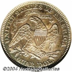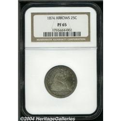 <B>1874<25C> Arrows PR 65 NGC.</B></I> This is a moderately toned Gem proof with splendid ivory, russet, and blue toning on the obverse. The reverse has deeper heather and iridescent coloration. A tiny curved lint mark is visible at the left arrow point. Population: 37 in 65, 14 finer (7/04). <BR><BR><B>Important notice:</B> Heritage usually auctions material at the rate of 200-250 lots per hour. On some occasions eBay Live bid software or the Internet may not be able to keep up with the pace of the auction. We recommend placing a realistic absentee bid now as insurance to avoid disappointment. Occasionally the auctioneer may eliminate or reject an eBay Live bid, and the auctioneer may also reopen a lot after the close of the eBay live bidding (usually because we missed an audience bid), and may reject your bid even if it shows you as the winning bidder. By bidding via eBay Live, you agree that Heritage may award the lot to another bidder at its sole discretion under the circumstances described above or any other reasonable circumstances. Since eBay bids are not shown to us until we open the lot on the floor, we treat those bids just like floor bids. In most cases the floor responds before the eBay bid is presented to us, due to Internet lag time, so for consistency we have made it a policy that floor bids are always considered first over tie eBay live bids. Also please note that all Heritage lots purchased through eBay Live carry a 20% Buyer's Premium. Please make sure you read the Terms and Conditions before you bid. </span></font></tr></table></td></tr></table>