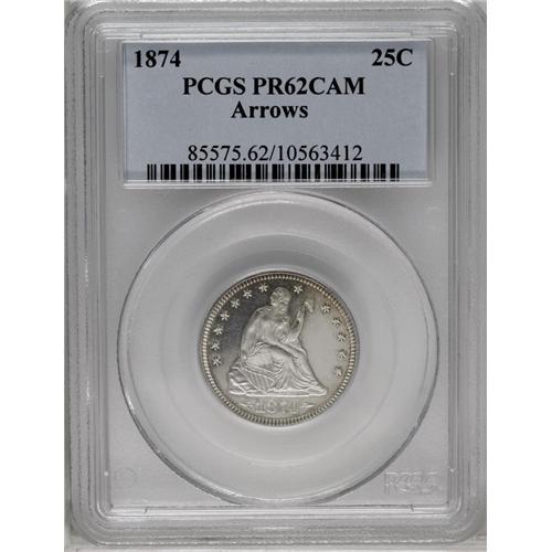 <B>1874<25C> Arrows PR62 Cameo PCGS.</B></I> Dramatic ice-white devices provide obvious contrast with the mirrored fields. Faint hairlines are detected, but these are mild for the PR62 level. Only 700 proofs were struck, and the 540 specimens from 1873 constitute all of the two-year proof type. Population: 2 in 62 Cameo, 24 finer (6/06).