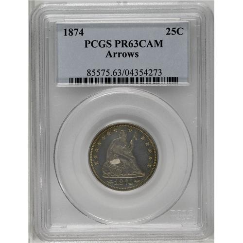 <B>1874<25C> Arrows PR63 Cameo PCGS.</B></I> Slate-gray surfaces with peripheral gold toning on both sides. The reverse is rotated a few degrees counterclockwise. Light hairlines and other minor blemishes are visible, but not distracting.