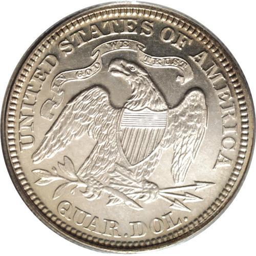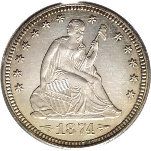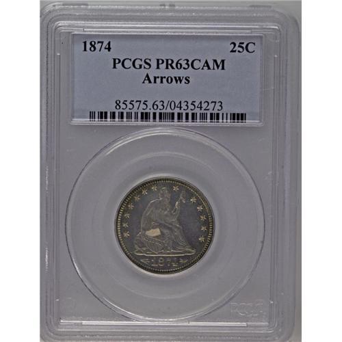 <B>1874<25C> Arrows PR63 Cameo PCGS.</B></I> Slate-gray surfaces with peripheral gold toning on both sides. The reverse is rotated a few degrees counterclockwise. Bold cameo contrast is obvious on obverse and reverse. Light hairlines and other minor blemishes are visible, but not distracting. An extremely attractive coin for the grade.