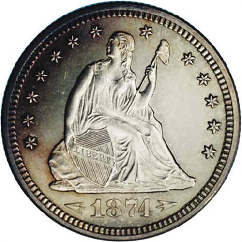 <B>1874<25C> Arrows PR63 NGC.</B></I> Rose and gold color illuminates the date and left side stars, and accompanies UNITED on the reverse. A bold and untroubled piece with an especially clean reverse. Proof type collectors soon discover how elusive the Arrows Quarter is, since it was struck in limited quantities for just two years. Minor strike doubling affects the stars and Liberty's profile.
