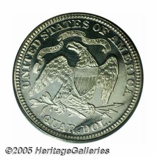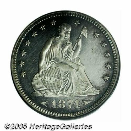 <B>1874<25C> Arrows PR64 Cameo PCGS.</B></I> A lovely, well contrasted specimen with tinges of lilac and pastel-blue toning about the margins. In addition to its scarcity with the Cameo designation, the importance of the 1874 is magnified by its two-year type status. Population: 7 in 64 Cameo, 14 finer (4/05).