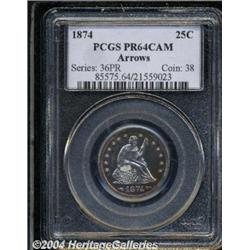 <B>1874<25C> Arrows PR64 Cameo PCGS.</B></I> Glassy, untoned centers reveal substantial contrast and are framed in orange-lilac shades. Wispy hairlines keep this flashy specimen from the Gem ranks. Population: 5 in 64 Cameo, 11 finer (4/04). <BR><BR><B>Important notice:</B> Heritage usually auctions material at the rate of 200-250 lots per hour. On some occasions eBay Live bid software or the Internet may not be able to keep up with the pace of the auction. We recommend placing a realistic absentee bid now as insurance to avoid disappointment. Occasionally the auctioneer may eliminate or reject an eBay Live bid, and the auctioneer may also reopen a lot after the close of the eBay live bidding (usually because we missed an audience bid), and may reject your bid even if it shows you as the winning bidder. By bidding via eBay Live, you agree that Heritage may award the lot to another bidder at its sole discretion under the circumstances described above or any other reasonable circumstances. Since eBay bids are not shown to us until we open the lot on the floor, we treat those bids just like floor bids. In most cases the floor responds before the eBay bid is presented to us, due to Internet lag time, so for consistency we have made it a policy that floor bids are always considered first over tie eBay live bids. Also please note that all Heritage lots purchased through eBay Live carry a 20% Buyer's Premium. Please make sure you read the Terms and Conditions before you bid.