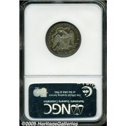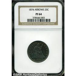 <B>1874 25C Arrows PR64 NGC.</B></I> Deep aquamarine color fills the obverse, the reverse features pleasing ruby-red and orange peripheral patina. A few tiny toning flecks accompany the obverse, and the right obverse field has a few faint slide marks. A scarce two-year proof type. Only 700 pieces were struck, a miniscule production when compared with such modern rarities as the 1995-W Silver Eagle.
