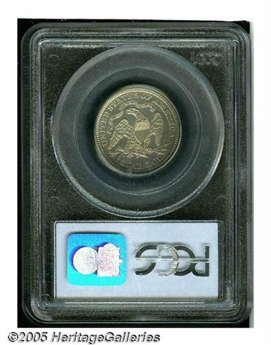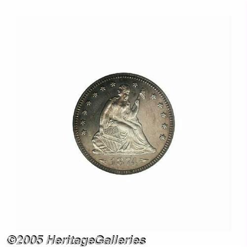 <B>1874<25C> Arrows PR64 PCGS.</B></I> Bright, watery surfaces display tinges of orange toning at the margins. A speckle or two of dark gray color is on the base of the eagle's shield. This well struck near-Gem can be identified in future auction appearances by a short mint-made lintmark between Liberty's rock and the first star. A scarce two-year proof type, one of just 700 proofs issued.
