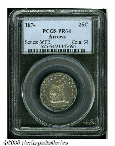 1874 25C Arrows PR64 PCGS. Bright, watery surface