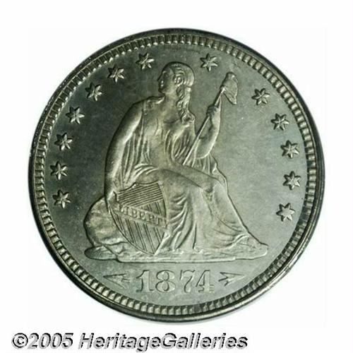 <B>1874<25C> Arrows PR64 PCGS.</B></I> Watery, minimally hairlined surfaces display a thin veil of hazy patina that tends to diminish the degree of contrast on this well preserved representative. Desirable two-year type.