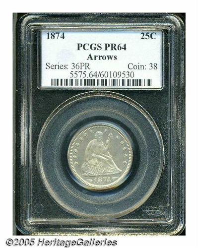 1874 25C Arrows PR64 PCGS. Watery, minimally hair