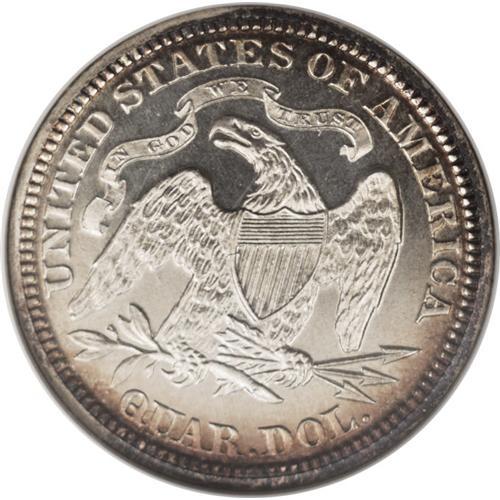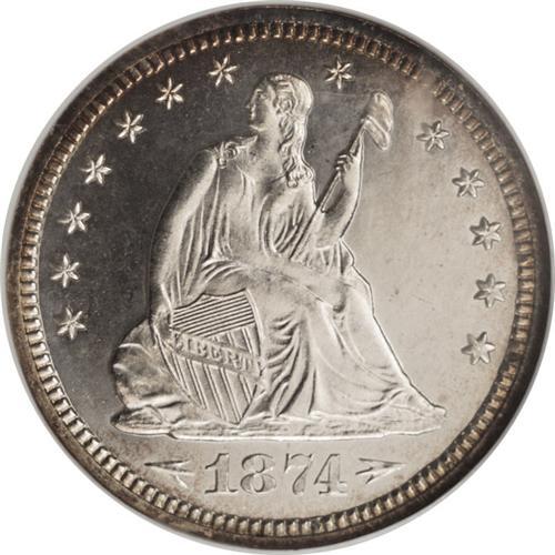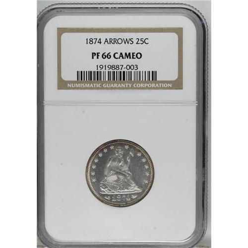 <B>1874 25C Arrows PR66 Cameo NGC.</B></I> The 1874 Arrows is an important type coin, a design motif that was used only in 1873 and 1874 in the With Motto series. The surfaces on this piece are mostly brilliant, with the exception of a light accent of golden-brown peripheral color. The devices are generously frosted and present starkly against the deeply mirrored proof fields. An exceptional cameoed example. Census: 8 in 66, 0 finer (4/07).<BR><BR><b>Shipping:</b> Coins & Currency (<a target="_blank" href="http://www.heritageauctions.com/common/shipping.php">view shipping information</a>)