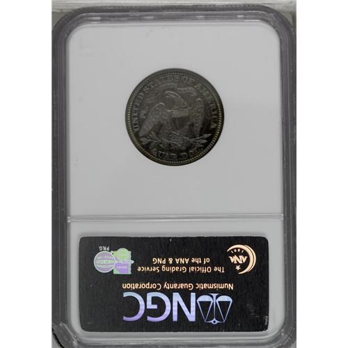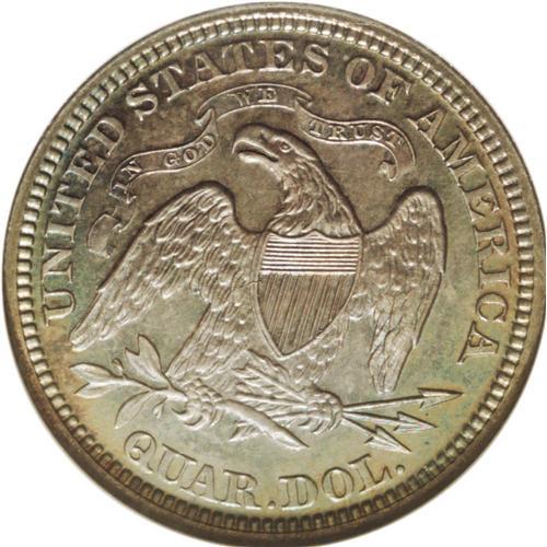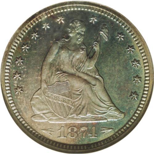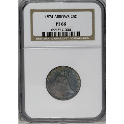 <B>1874<25C> Arrows PR66 NGC.</B></I> This Premium Gem proof is one of 700 pieces struck in this year. Luminous surfaces are blanketed in iridescent cobalt-blue, orange-gold, and lavender toning, and offer a cameo-like effect when the coin is tilted beneath a light source. The design elements are exquisitely brought up, and both sides are devoid of significant marks. Census: 12 in 66, 6 finer (5/06).