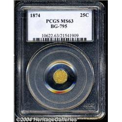 <B>1874<25C> Indian Octagonal 25 Cents, BG-795, R.3, MS63 PCGS.</B></I> Blushes of golden-brown patina visit this carefully preserved and attractively detailed example. A small and nearly circular planchet flaw (as made) is noted on the Indian's cheek. <BR><BR><B>Important notice:</B> Heritage usually auctions material at the rate of 200-250 lots per hour. On some occasions eBay Live bid software or the Internet may not be able to keep up with the pace of the auction. We recommend placing a realistic absentee bid now as insurance to avoid disappointment. Occasionally the auctioneer may eliminate or reject an eBay Live bid, and the auctioneer may also reopen a lot after the close of the eBay live bidding (usually because we missed an audience bid), and may reject your bid even if it shows you as the winning bidder. By bidding via eBay Live, you agree that Heritage may award the lot to another bidder at its sole discretion under the circumstances described above or any other reasonable circumstances. Since eBay bids are not shown to us until we open the lot on the floor, we treat those bids just like floor bids. In most cases the floor responds before the eBay bid is presented to us, due to Internet lag time, so for consistency we have made it a policy that floor bids are always considered first over tie eBay live bids. Also please note that all Heritage lots purchased through eBay Live carry a 20% Buyer's Premium. Please make sure you read the Terms and Conditions before you bid.