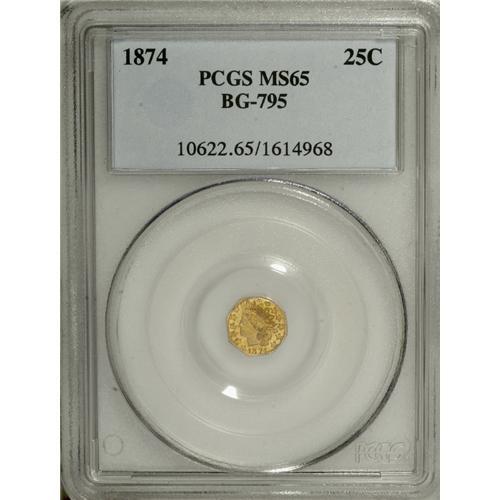 <B>1874 25C Indian Octagonal 25 Cents, BG-795, R.3, MS65 PCGS.</B></I> A brightly mirrored canary-gold Gem that is well struck except for a couple of wreath berries. Population: 16 in 65, 3 finer (4/07).<BR><BR><b>Shipping:</b> Coins & Currency (<a target="_blank" href="http://www.heritageauctions.com/common/shipping.php">view shipping information</a>)