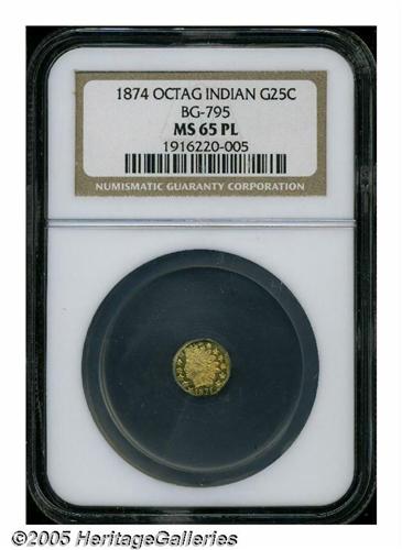 <B>1874<25C> Indian Octagonal 25 Cents, BG-795, R.3, MS65 Prooflike NGC.</B></I> A lovely piece with flashy mirrored fields and clean surfaces. Only the bottom of the first L in DOLLAR is not well struck.