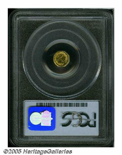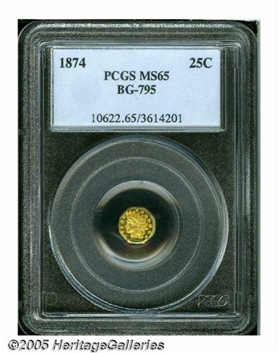 <B>1874<25C> Indian Octagonal 25 Cents, BG-795, R.3, MS65 PCGS.</B></I> The date on this coin slopes sharply down until the 4 touches the rim. This is a bright, green-gold example that shows deep prooflikeness in the fields. The dies are rotated by approximately one hundred and thirty-five degrees, and there are touches of dark-gray verdigris on the lower reverse. Population: 16 in 65, 2 finer (5/05).