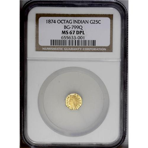 <B>1874<25C> Indian Octagonal 25 Cents, BG-799Q, High R.5, MS67 Deep Mirror Prooflike NGC.</B></I> A rare variety that offers a widely repunched third star, while the right leg of the R in DOLLAR points to a berry. Well struck with impressive prooflike surfaces. A pair of thick die lines are noted on the Indian's neck. A tiny planchet flaw (as made) near 11 o'clock on the reverse is mentioned solely for pedigree purposes. Struck with medal turn. This beautiful Superb Gem is easily the highest-graded example at either of the major services. Census: 1 in 67 Deep Mirror Prooflike, 0 finer (7/06).