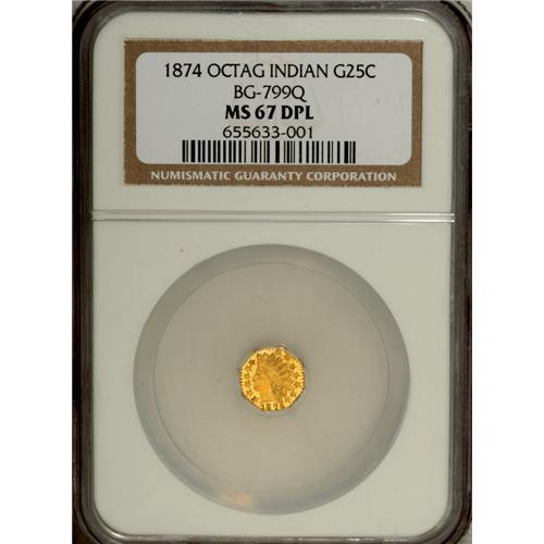 <B>1874 25C Indian Octagonal 25 Cents, BG-799Q, High R.5, MS67 Deep Mirror Prooflike NGC.</B></I> Attributed by a widely repunched third star, while the right leg of the R in DOLLAR points to a berry. Well struck with impressive prooflike surfaces. A pair of thick die lines are noted on the Indian's neck. A tiny planchet flaw near 11 o'clock on the reverse is mentioned solely for pedigree purposes. Struck with medal turn. This beautiful Superb Gem is easily the highest-graded example at either of the major services. Census: 1 in 67 Deep Mirror Prooflike, 0 finer (12/06).<BR><BR><b>Shipping:</b> Coin/Currency (<a target="_blank" href="http://www.heritageauctions.com/common/shipping.php">view shipping information</a>)