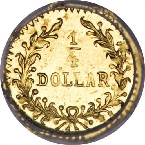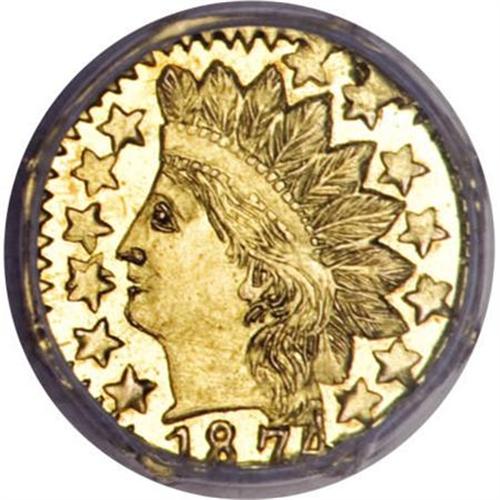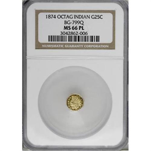 <B>1874 25C Indian Octagonal 25 Cents, BG-799Q, High R.5, MS66 Prooflike NGC.</B></I> A splendid cameo example of the scarce variety with exceptional overall quality. The reverse is rotated a quarter turn to the right from standard coin alignment. The present example is arguably one of the finest known examples of the variety.<BR><BR><b>Shipping:</b> Coins & Currency (<a target="_blank" href="http://www.heritageauctions.com/common/shipping.php">view shipping information</a>)