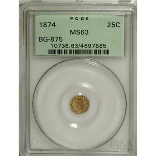 <B>1874 25C Indian Round 25 Cents, BG-875, High R.4, MS63 PCGS.</B></I> PCGS Population (16/38). NGC Census: (1/1). (#10736)<BR><BR><b>Shipping:</b> Coins & Currency (<a target="_blank" href="http://www.heritageauctions.com/common/shipping.php">view shipping information</a>)