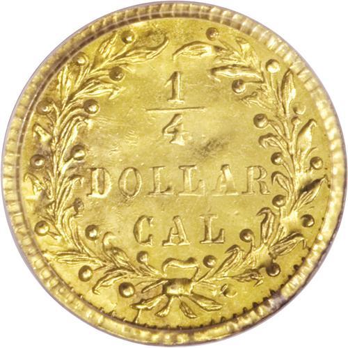 <B>1874 25C Indian Round 25 Cents, BG-875, High R.4, MS65 PCGS.</B></I> Highly prooflike fields along with heavy satin luster on the devices produce a virtual cameo effect on this highly elusive Period Two piece. Bright honey-gold color and a bold strike attest to the originality of this rare Gem. A pair of die flaws near the 4 in the fraction and the second L in DOLLAR, along with repunching of the stars on the obverse are indicative of this variety. None have been graded finer at either service (12/06).<BR><BR><b>Shipping:</b> Coin/Currency (<a target="_blank" href="http://www.heritageauctions.com/common/shipping.php">view shipping information</a>)