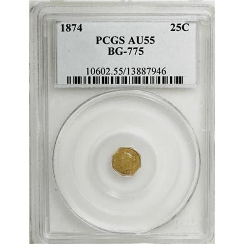 <B>1874 25C Liberty Octagonal 25 Cents, BG-775, High R.6, AU55 PCGS.</B></I> PCGS Population (2/8). NGC Census: (0/1). (#10602)<BR><BR><b>Shipping:</b> Coins & Currency (<a target="_blank" href="http://www.heritageauctions.com/common/shipping.php">view shipping information</a>)