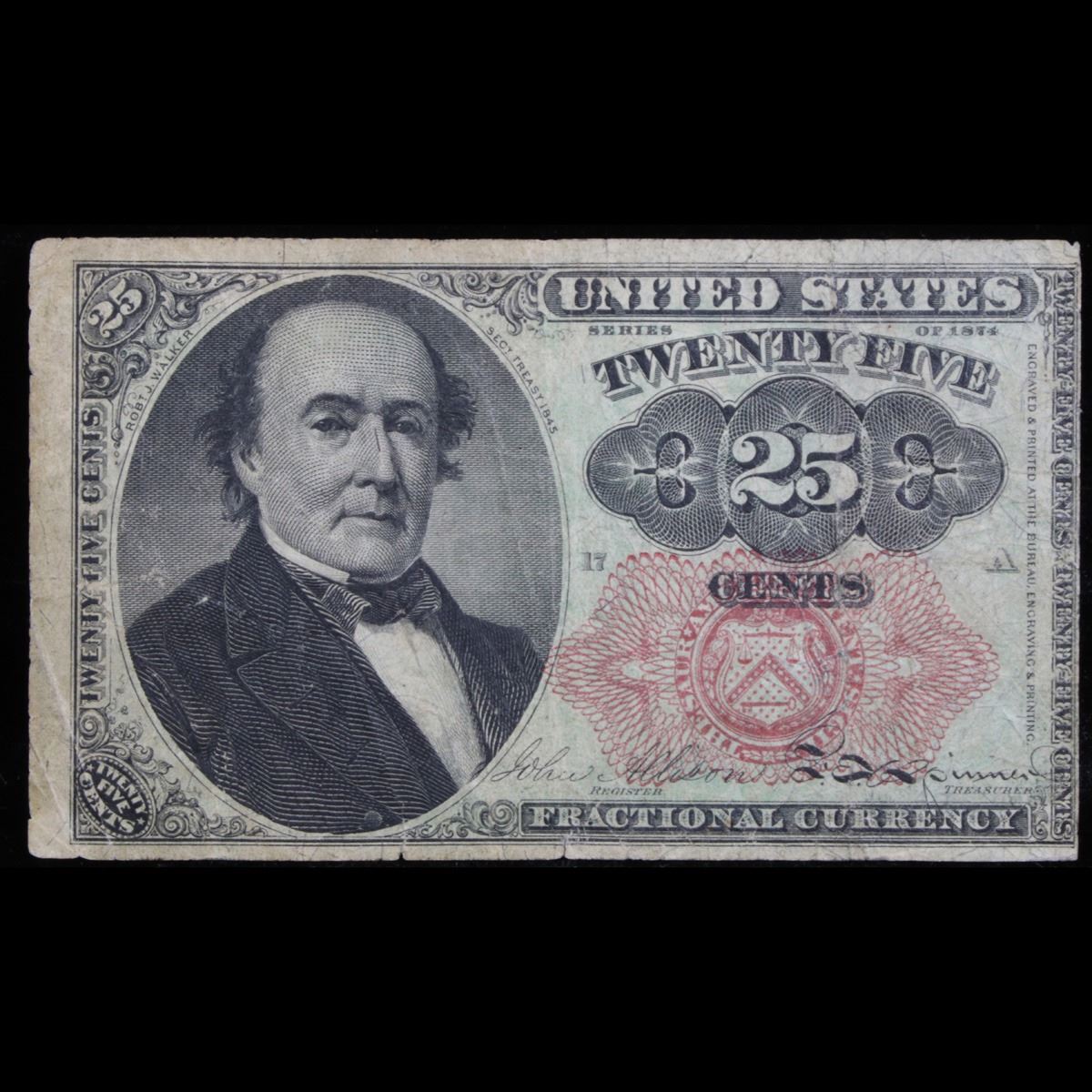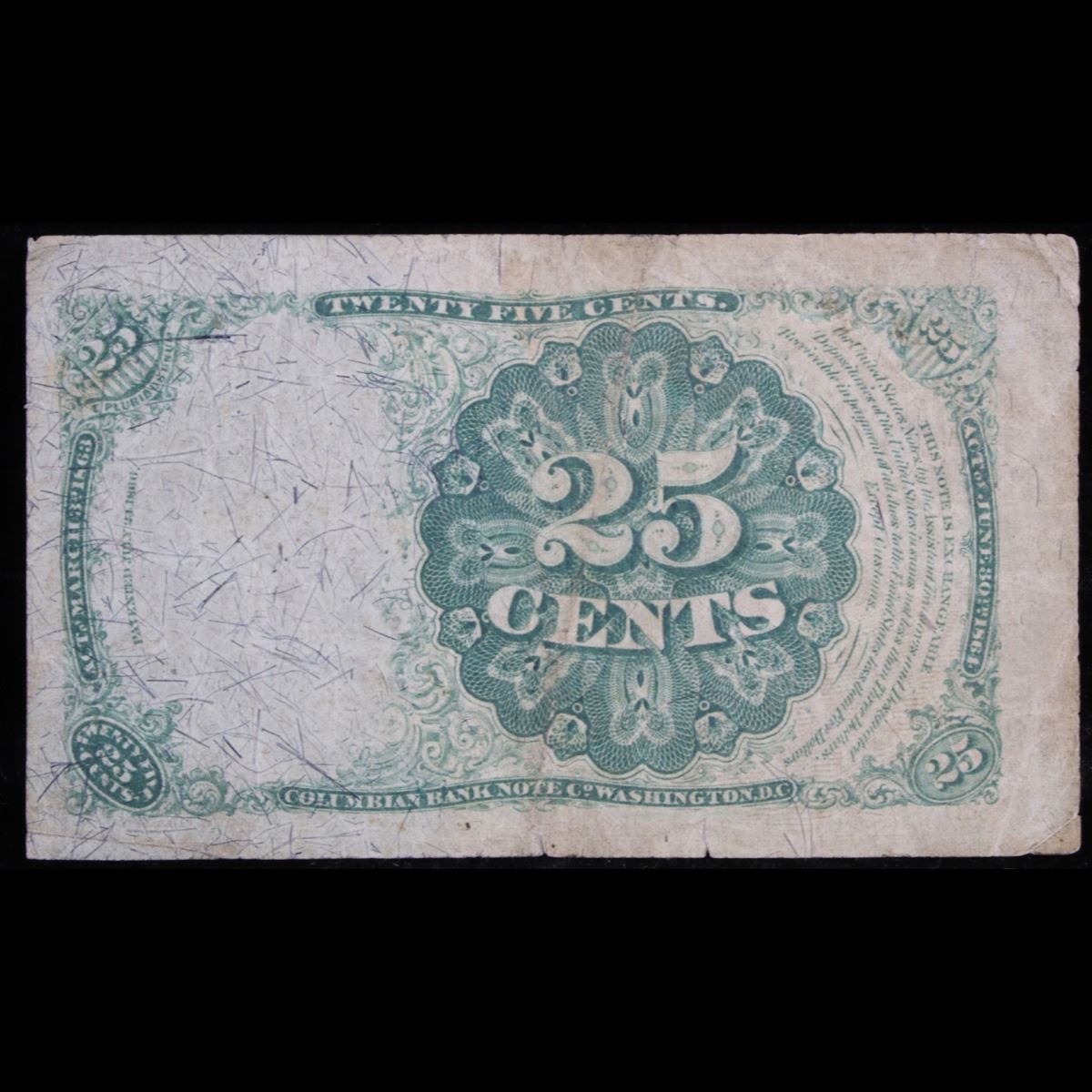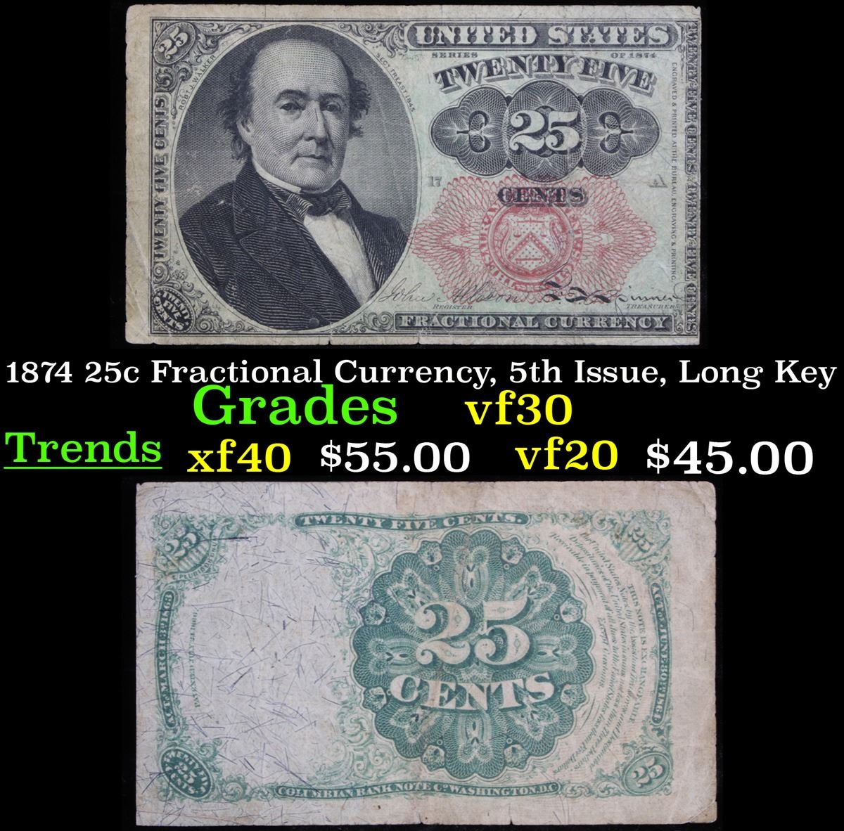 1874 25c Fractional Currency, 5th Issue, Long Key Grades vf++. FR# 1308. Fractional or postage currency has a rich history. At the beginning of the Civil War people starting hoarding coins for their precious metal content. Coins became difficult to find because of the hoarding. People started to try to use stamps instead of coins as a means of commerce. The government decided to help ease the hoarding issue by issuing “paper coins” also known as postage currency or fractional currency. Fractional currency was first issued on August 21, 1862 and they were last issued on February 15, 1876. Three cents, five cents, ten cents, twenty-five cents, and fifty cents notes were all issued. Fractional currency is physically smaller than other United States money. It also does not have a serial number.