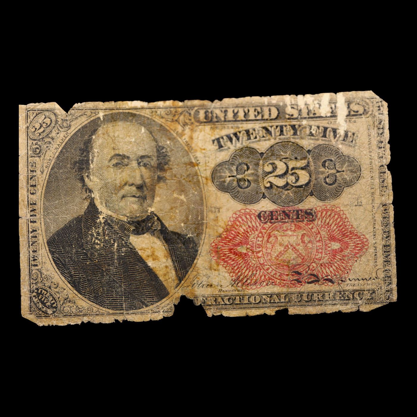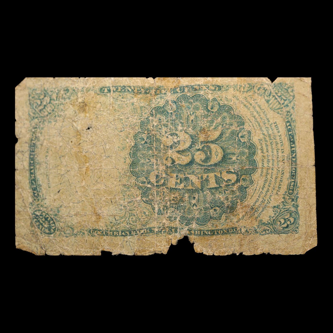 1874 25c Fractional Currency, 5th Issue, Short Key FR-1309 Grades f details. FR# 1309. Fractional or postage currency has a rich history. At the beginning of the Civil War people starting hoarding coins for their precious metal content. Coins became difficult to find because of the hoarding. People started to try to use stamps instead of coins as a means of commerce. The government decided to help ease the hoarding issue by issuing “paper coins” also known as postage currency or fractional currency. Fractional currency was first issued on August 21, 1862 and they were last issued on February 15, 1876. Three cents, five cents, ten cents, twenty-five cents, and fifty cents notes were all issued. Fractional currency is physically smaller than other United States money. It also does not have a serial number.