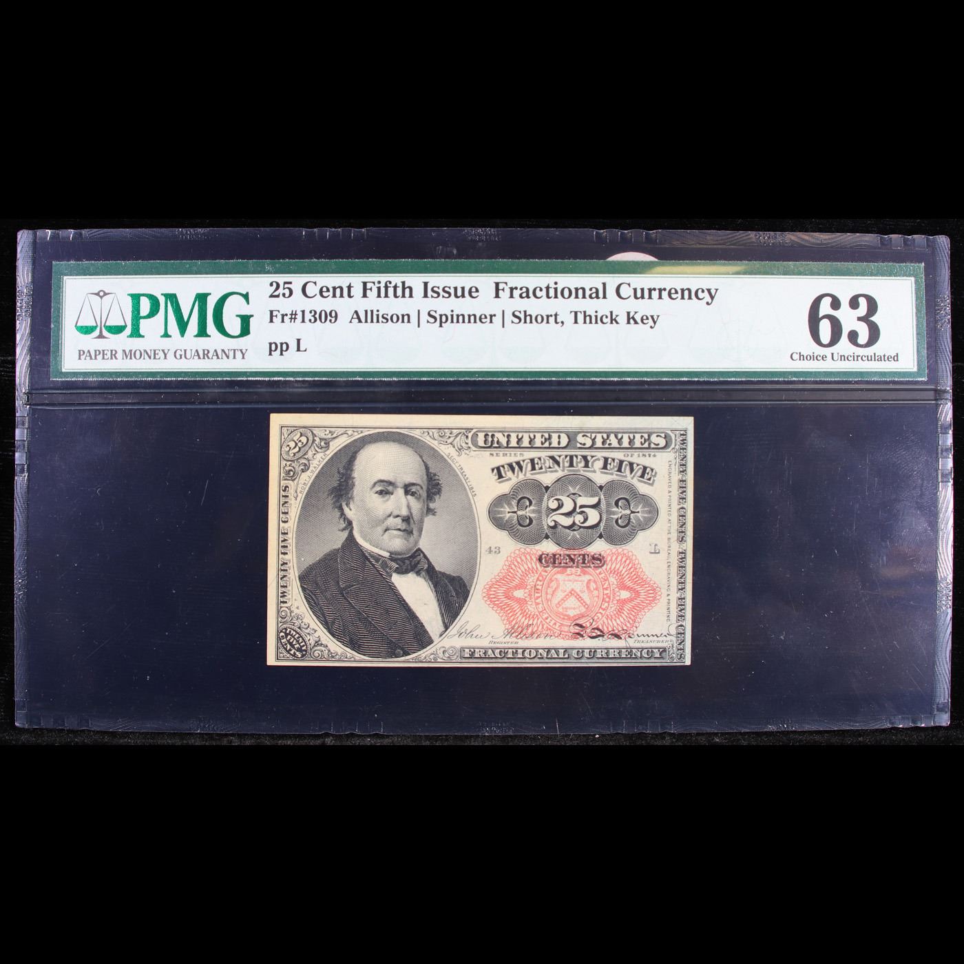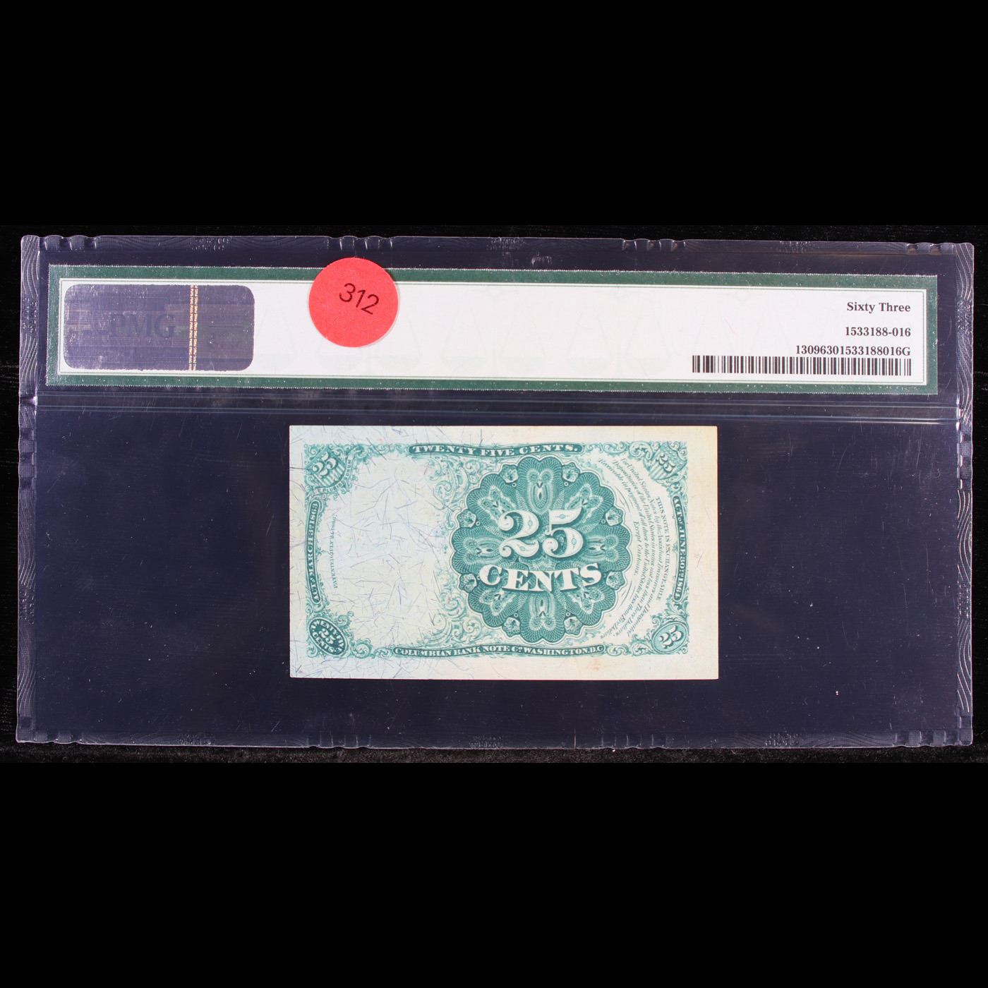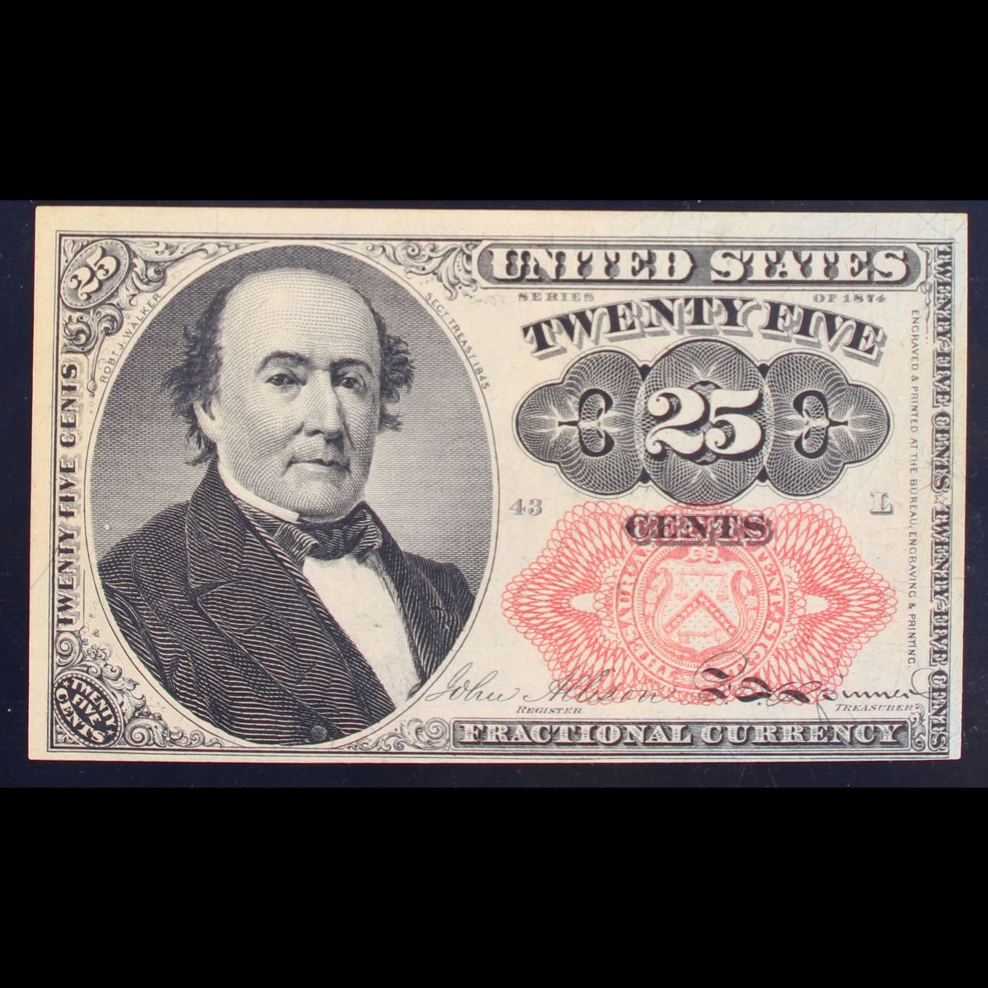 1874 25c Fractional Currency, 5th Issue, Short Key Fr-1309 Graded cu63 By PMG. Fractional or postage currency has a rich history. At the beginning of the Civil War people starting hoarding coins for their precious metal content. Coins became difficult to find because of the hoarding. People started to try to use stamps instead of coins as a means of commerce. The government decided to help ease the hoarding issue by issuing “paper coins” also known as postage currency or fractional currency. Fractional currency was first issued on August 21, 1862 and they were last issued on February 15, 1876. Three cents, five cents, ten cents, twenty-five cents, and fifty cents notes were all issued. Fractional currency is physically smaller than other United States money. It also does not have a serial number.