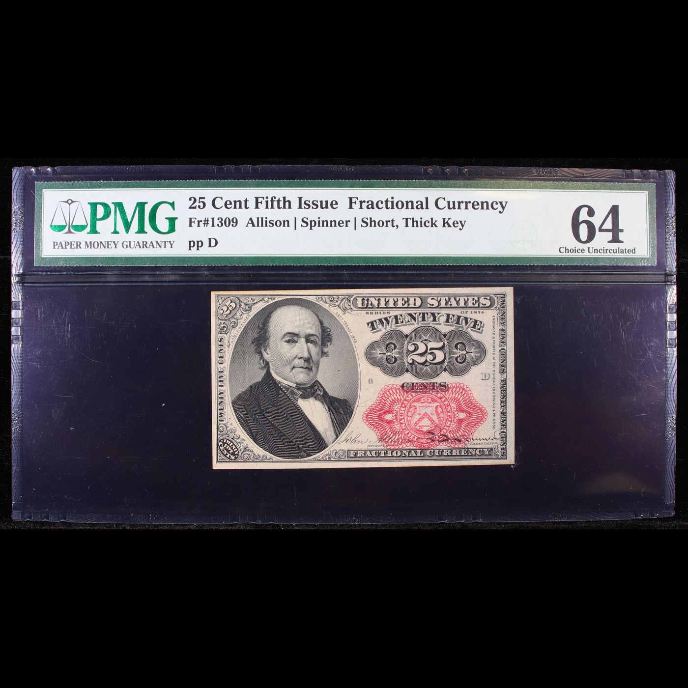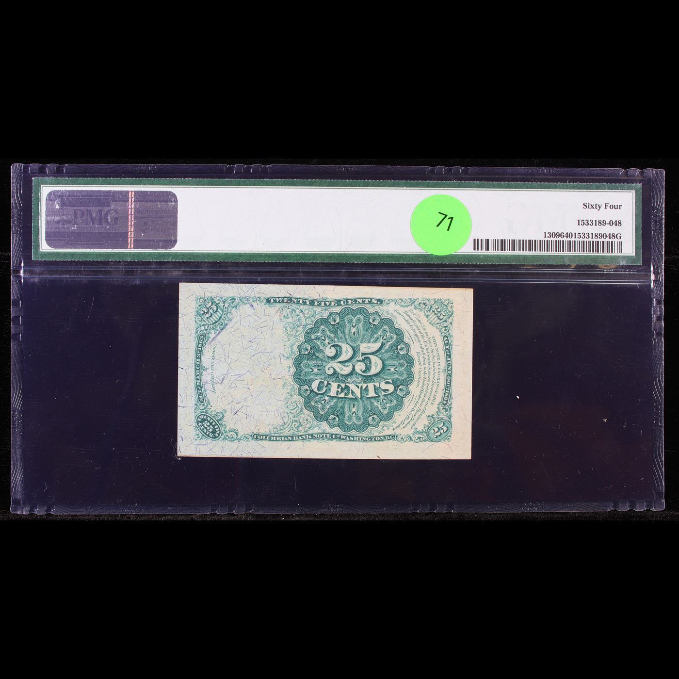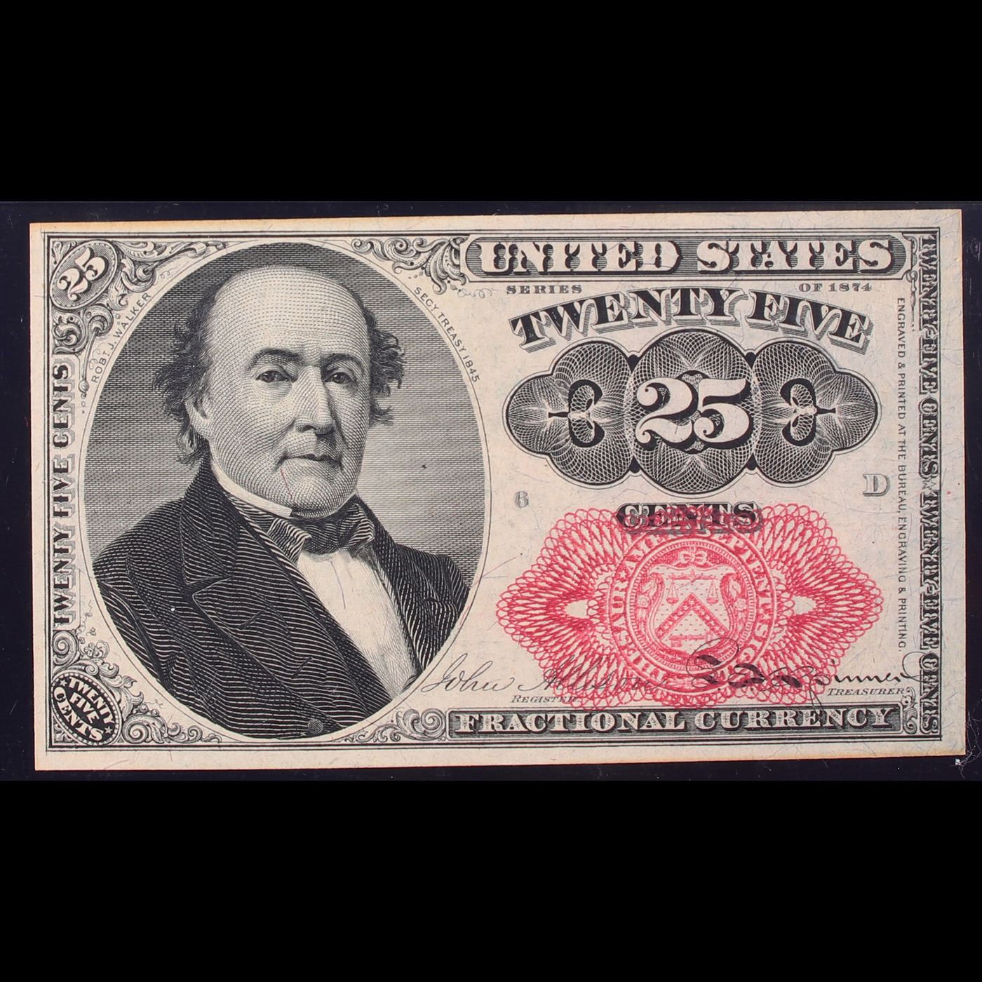 1874 25c Fractional Currency, 5th Issue, Short Key Fr-1309 Graded cu64 By PMG. Fractional or postage currency has a rich history. At the beginning of the Civil War people starting hoarding coins for their precious metal content. Coins became difficult to find because of the hoarding. People started to try to use stamps instead of coins as a means of commerce. The government decided to help ease the hoarding issue by issuing “paper coins” also known as postage currency or fractional currency. Fractional currency was first issued on August 21, 1862 and they were last issued on February 15, 1876. Three cents, five cents, ten cents, twenty-five cents, and fifty cents notes were all issued. Fractional currency is physically smaller than other United States money. It also does not have a serial number.