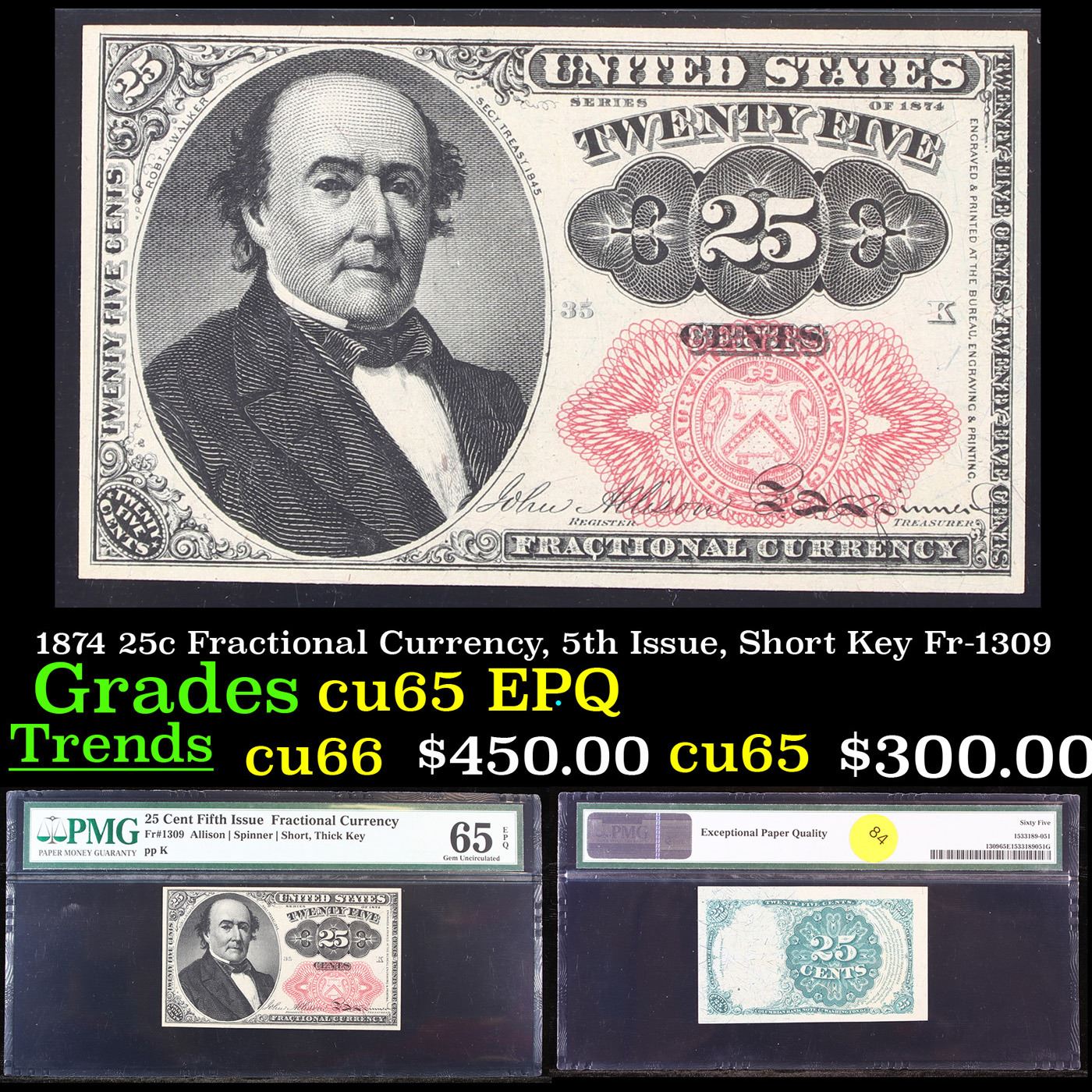 1874 25c Fractional Currency, 5th Issue, Short Key Fr-1309 Graded cu65 EPQ By PMG