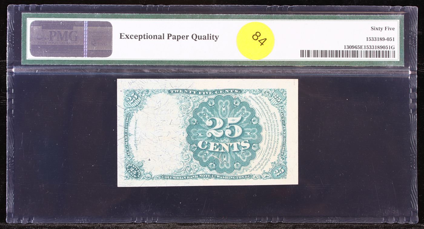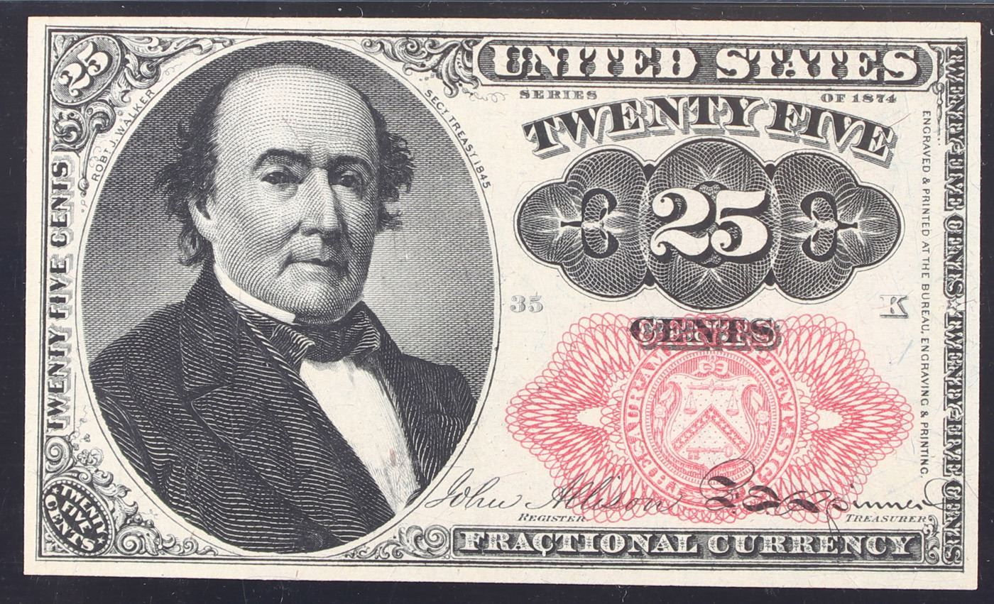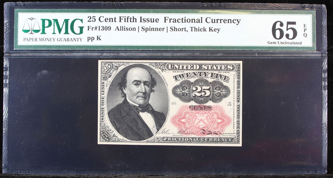 1874 25c Fractional Currency, 5th Issue, Short Key Fr-1309 Graded cu65 EPQ By PMG. Fractional or postage currency has a rich history. At the beginning of the Civil War people starting hoarding coins for their precious metal content. Coins became difficult to find because of the hoarding. People started to try to use stamps instead of coins as a means of commerce. The government decided to help ease the hoarding issue by issuing “paper coins” also known as postage currency or fractional currency. Fractional currency was first issued on August 21, 1862 and they were last issued on February 15, 1876. Three cents, five cents, ten cents, twenty-five cents, and fifty cents notes were all issued. Fractional currency is physically smaller than other United States money. It also does not have a serial number.