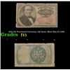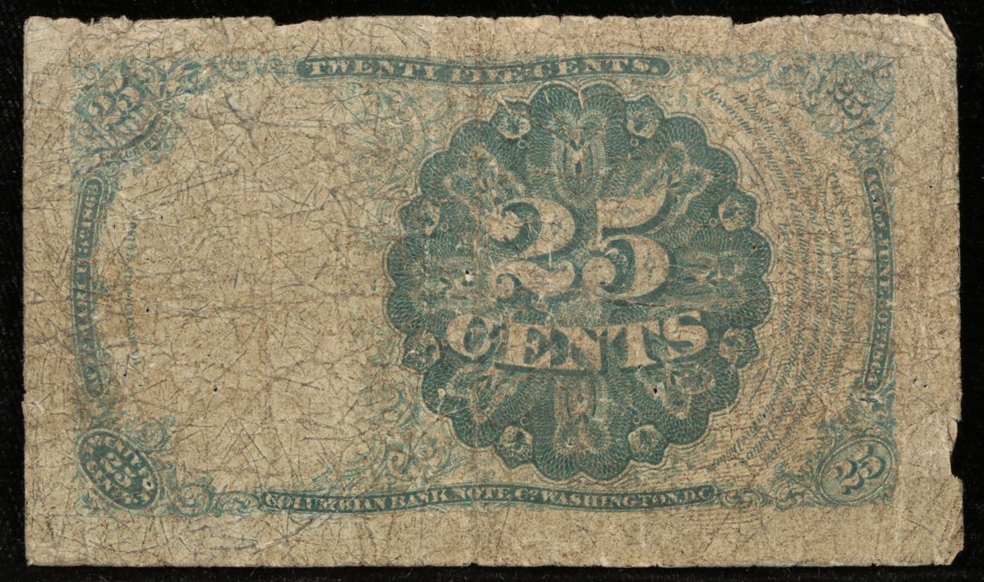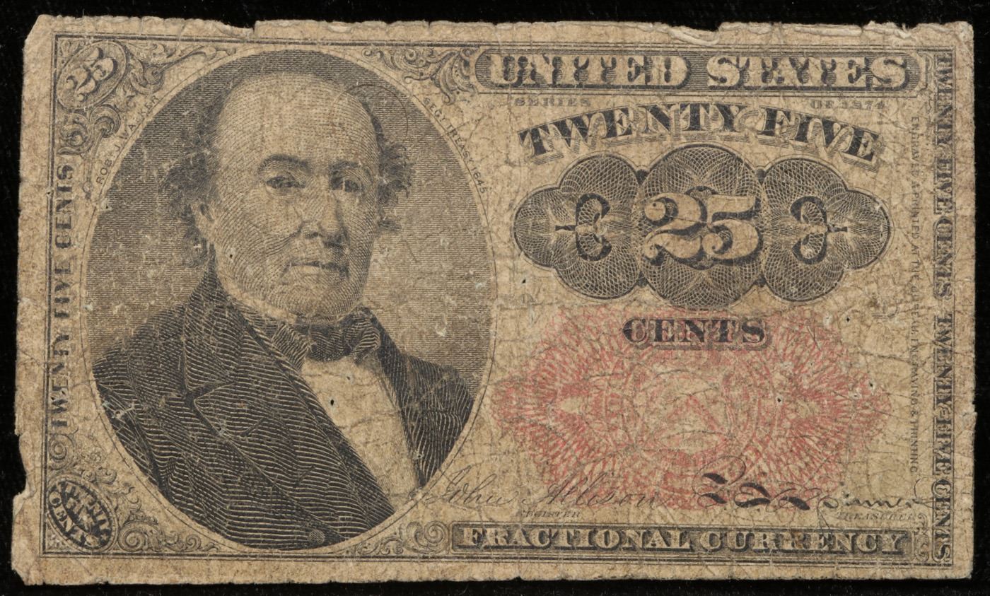 1874 25c Fractional Currency, 5th Issue, Short Key Fr-1309 Grades f+. Fractional or postage currency has a rich history. At the beginning of the Civil War people starting hoarding coins for their precious metal content. Coins became difficult to find because of the hoarding. People started to try to use stamps instead of coins as a means of commerce. The government decided to help ease the hoarding issue by issuing “paper coins” also known as postage currency or fractional currency. Fractional currency was first issued on August 21, 1862 and they were last issued on February 15, 1876. Three cents, five cents, ten cents, twenty-five cents, and fifty cents notes were all issued. Fractional currency is physically smaller than other United States money. It also does not have a serial number.