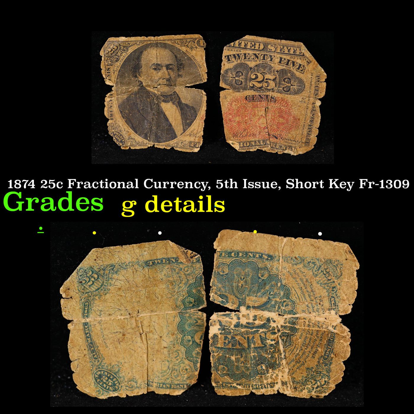 1874 25c Fractional Currency, 5th Issue, Short Key Fr-1309 Grades g details