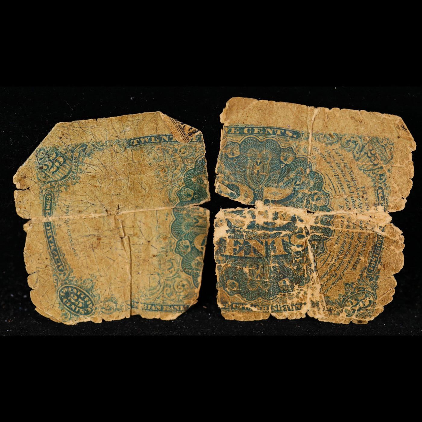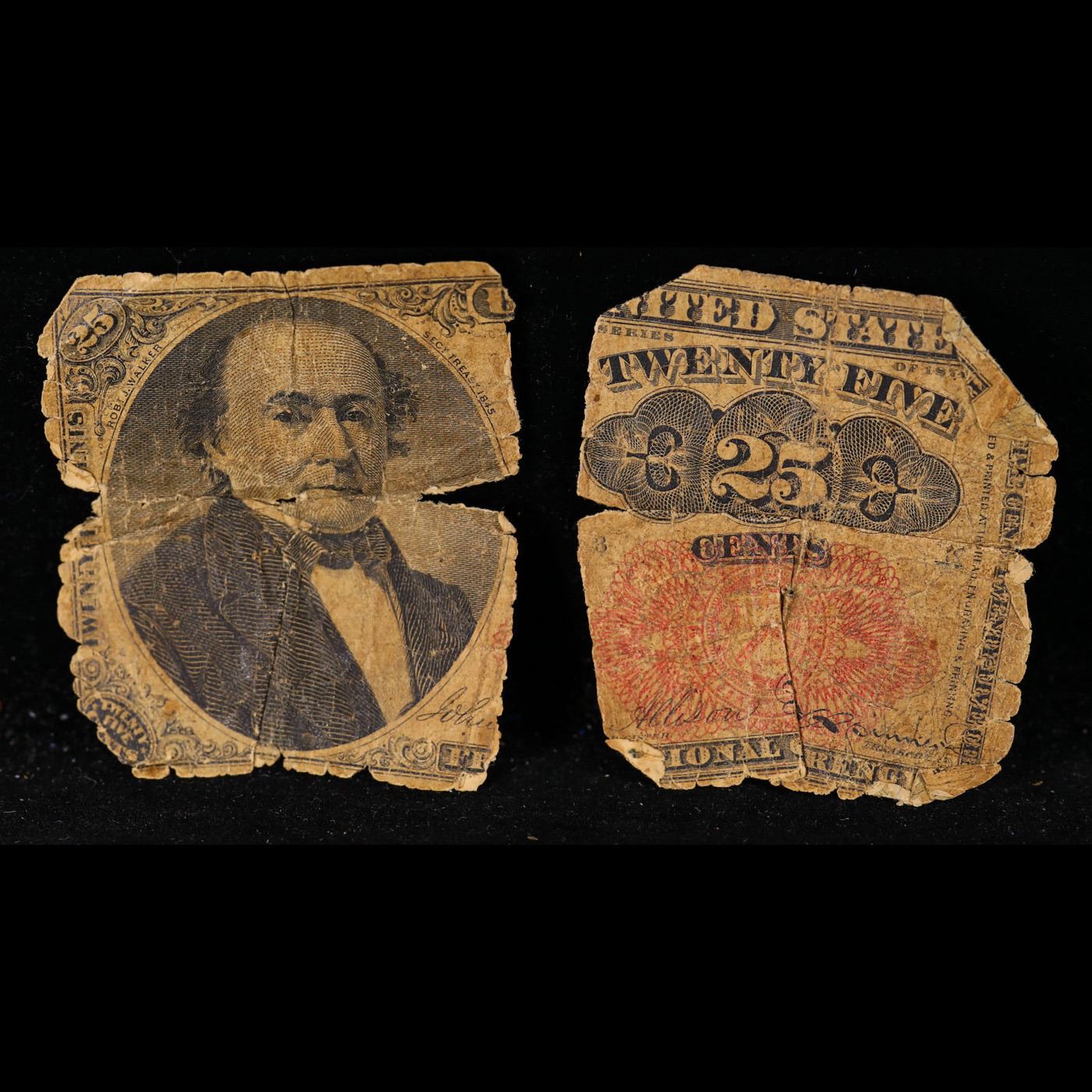 1874 25c Fractional Currency, 5th Issue, Short Key Fr-1309 Grades g details. Fractional or postage currency has a rich history. At the beginning of the Civil War people starting hoarding coins for their precious metal content. Coins became difficult to find because of the hoarding. People started to try to use stamps instead of coins as a means of commerce. The government decided to help ease the hoarding issue by issuing “paper coins” also known as postage currency or fractional currency. Fractional currency was first issued on August 21, 1862 and they were last issued on February 15, 1876. Three cents, five cents, ten cents, twenty-five cents, and fifty cents notes were all issued. Fractional currency is physically smaller than other United States money. It also does not have a serial number.