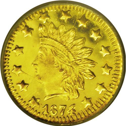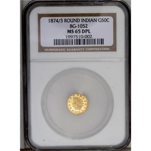 <B>1874/3<50C> Indian Round 50 Cents, BG-1052, High R.4, MS65 Deep Mirror Prooflike NGC.</B></I> The immensely reflective fields are yellow-gold, while the devices have a more orange-gold cast. The highly polished dies are in a late state, with several die cracks and some erosion, not to mention the overdate.
