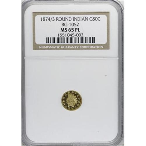 <B>1874/3 50C Indian Round 50 Cents, BG-1052, High R.4, MS65 Prooflike NGC.</B></I> Gorgeous yellow-gold surfaces display a noticeable cameo-like effect. Exceptionally well struck, save for slight softness in the A of DOLLAR. Census: 2 in 65 Prooflike, 2 finer as DPL (6/07).<BR><BR><b>Shipping:</b> Coins & Currency (<a target="_blank" href="http://www.heritageauctions.com/common/shipping.php">view shipping information</a>)