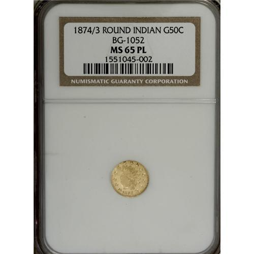 <B>1874/3 50C Indian Round 50 Cents, BG-1052, High R.4, MS65 Prooflike NGC.</B></I> Gorgeous yellow-gold surfaces display a noticeable cameo-like effect. Exceptionally well struck, save for slight softness in the A of DOLLAR. Census: 1 in 65 Prooflike, 1 finer as MS65 DPL (1/07).<BR><BR><b>Shipping:</b> Coins & Currency (<a target="_blank" href="http://www.heritageauctions.com/common/shipping.php">view shipping information</a>)