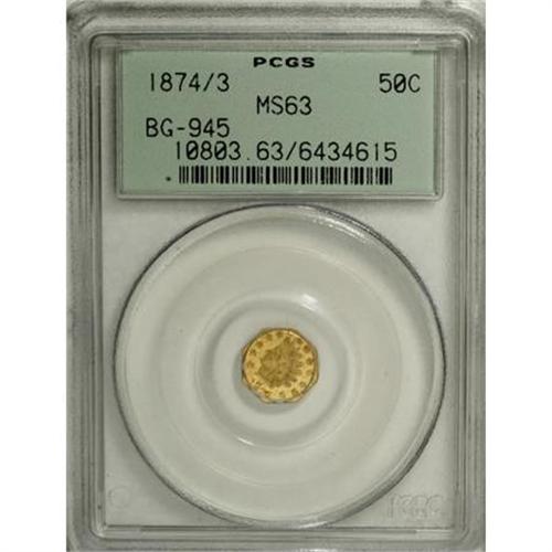 <B>1874/3 50C Indian Octagonal 50 Cents, BG-945, High R.4, MS63 PCGS.</B></I> PCGS Population (14/14). NGC Census: (2/3). (#10803)<BR><BR><b>Shipping:</b> Coins & Currency (<a target="_blank" href="http://www.heritageauctions.com/common/shipping.php">view shipping information</a>)
