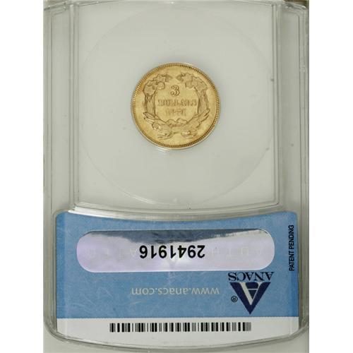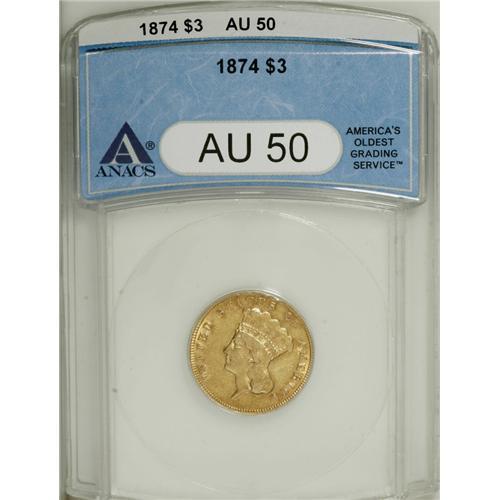 <B>1874 $3 AU50 ANACS.</B></I> A well struck and lightly worn yellow-orange piece that has significant peripheral luster. Occasional abrasions and scattered handling marks are present on each side.<BR><BR><b>Shipping:</b> Coins & Currency (<a target="_blank" href="http://www.heritageauctions.com/common/shipping.php">view shipping information</a>)