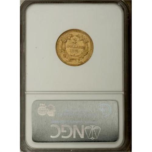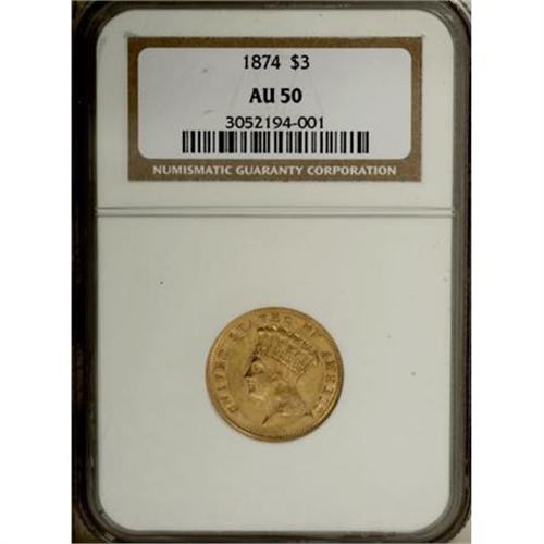 <B>1874 $3 AU50 NGC.</B></I> Light highpoint wear is apparent on this type three dollar gold piece, yet the overall visual appeal is strong, and the fields retain a surprising degree of luster. Light marks are present on the slightly hazy yellow-orange surfaces.<BR><BR><B>Coin Engraver:</B> James B. Longacre<BR><BR><b>Shipping:</b> Coins & Currency (<a target="_blank" href="http://www.heritageauctions.com/common/shipping.php">view shipping information</a>)