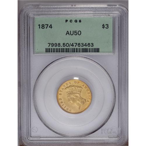 1874 $3 AU50 PCGS. Despite brief circulation, the marg
