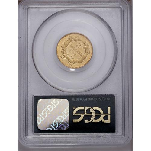 <B>1874 $3 AU50 PCGS.</B></I> Despite brief circulation, the margins, wreath, and legends are accompanied by ample glowing luster. No consequential marks are located. Certified in a green label holder.