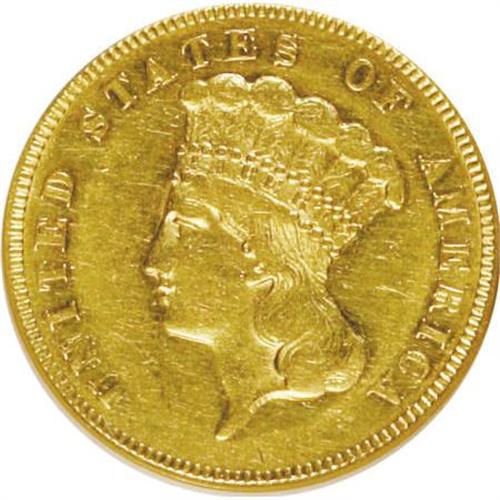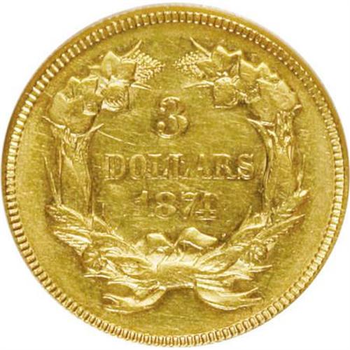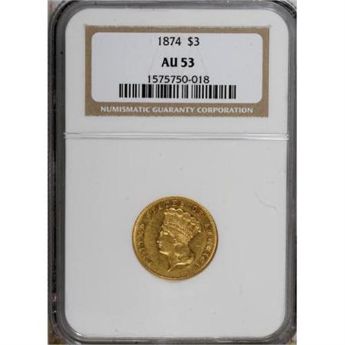 <B>1874 $3 AU53 NGC.</B></I> NGC Census: (98/1714). PCGS Population (129/1179). Mintage: 41,820. Numismedia Wsl. Price for NGC/PCGS coin in AU53: $1,340. (#7998)<BR><BR><B>Coin Engraver:</B> James B. Longacre<BR><BR><b>Shipping:</b> Coins & Currency (<a target="_blank" href="http://www.heritageauctions.com/common/shipping.php">view shipping information</a>)