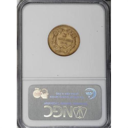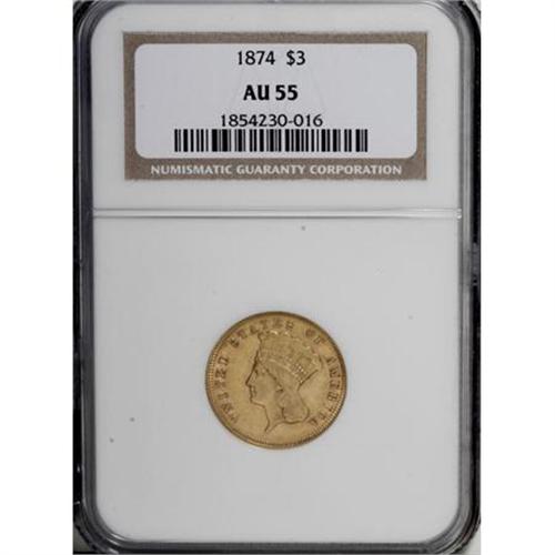 <B>1874 $3 AU55 NGC.</B></I> An ideal Choice AU type coin, slightly scarcer than the most common dates and free from remotely mentionable marks. Pockets of orange luster outline the legends and devices.<BR><BR><b>Shipping:</b> Coins & Currency (<a target="_blank" href="http://www.heritageauctions.com/common/shipping.php">view shipping information</a>)
